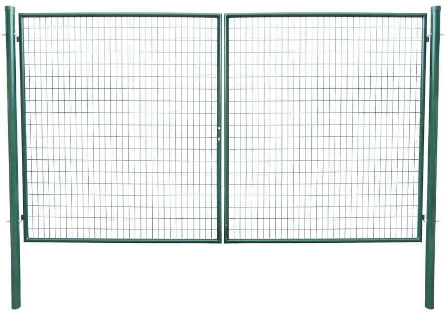 Záhradná dvojkrídlová brána s výplňou zváranej siete s okami vo veľkosti 50 x 100 mm a hrúbkou drôtu 3,5 mm. Priemer stĺpika je 76 mm. Úprava je zinok + PVC. Farba zelená.