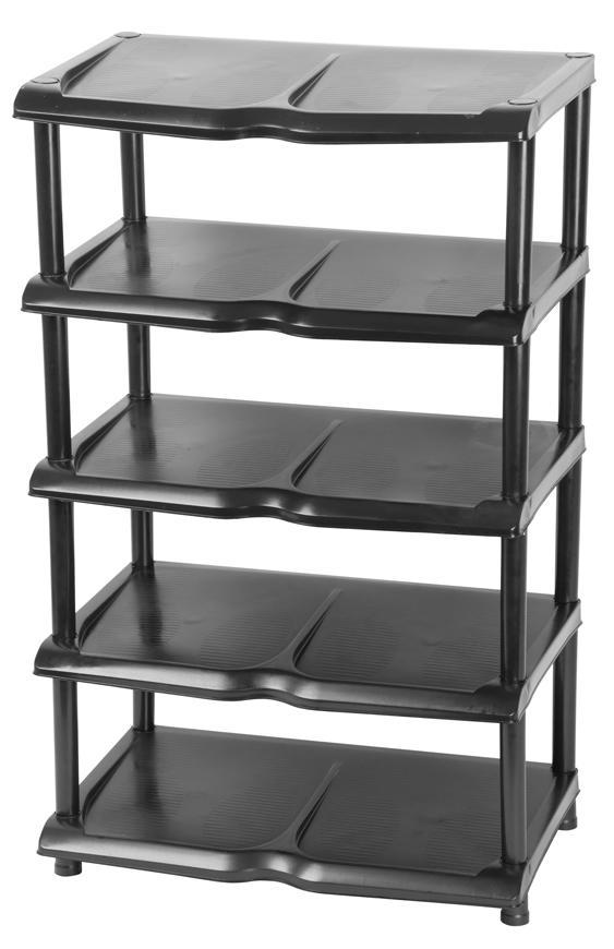 Perfektný regál na topánky Vám uľahčí uloženie topánok. Je dostatočne veľký - má až 5 poschodí, uložíte na neho až 10 párov topánok. Ľahko sa skladá, je jednoduchý na údržbu aj manipuláciu. Prevedenie: plast. Farba: čierna. Rozmery: 48x30,5x86 cm.