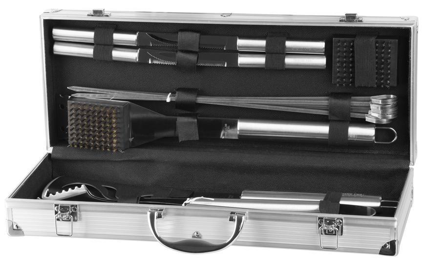 Luxusná sada náradia Strend Pro Grill pozostáva zo štrnástich komponentov zabalených v krásnom kufríku. Náradie je vyrobené z nehrdzavejúcej ocele, jednoduchý tvar umožňuje ľahké čistenie. Táto sada určite poteší každého grilmajstra.